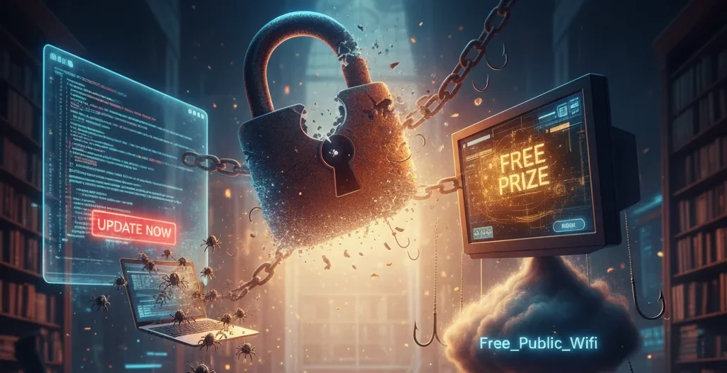 📶 Solusi: Gunakan VPN saat terhubung ke jaringan publik. Hindari akses layanan sensitif seperti e-banking di Wi-Fi umum.